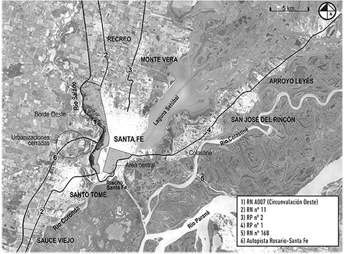 El territorio comprendido por Santa Fe y su área de expansión, espacio ocupado por casi medio millón de habitantes, responde a este patrón de crecimiento en torno a las principales vías de comunicación, dicho crecimiento ha sido limitado por los ríos Salado y Paraná. Las condiciones naturales de su emplazamiento han definido modos diferenciales de estructuración urbana, desde la formación de su tejido fundacional a los actuales procesos de expansión. Podría decirse que esta diferenciación se ha dado a partir de la relación del habitante santafesino con su medio circundante. Mientras el borde este de la ciudad ha sido objeto de múltiples revalorizaciones en armonía con la laguna Setúbal, el tratamiento del borde oeste quedó supeditado a un rechazo continuo de la margen del río Salado, junto con una constante negación del paisaje ribereño. Esta valoración diferencial, fundada en los albores del proceso urbano, dio lugar a un degradé socioespacial entre los márgenes este y oeste, proceso fragmentario que más tarde se profundizó con la expansión del tejido urbano sobre las vías de comunicación regional. Así, la extensión de funciones urbanas fue consolidándose a partir de un proceso complejo de interacción entre los usos emergentes, los nuevos patrones de movilidad y la valoración cultural del entorno natural, lo que ha dado lugar a diferentes connotaciones sobre los ejes de expansión y, por lo tanto, distintos modos de territorialización.