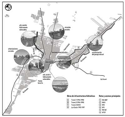 La fuerte incidencia que han tenido históricamente las particularidades geográficas del sitio en la configuración del entramado urbano y la determinación de su crecimiento lleva a considerar la relevancia que las obras de infraestructuras han asumido en dicho proceso. Con relación a ello, hacia mediados de la década de los noventa, la ciudad asistió a un periodo signado por el acceso a créditos con financiamiento externo del Banco Mundial, los cuales posibilitaron la concreción de obras públicas de relevancia. Este acceso al crédito se tradujo en la construcción de defensas hidráulicas y de viviendas “de interés social”. Las obras de defensas efectuadas tanto en proximidad al río Salado como a la Ruta Provincial n.° 1 (Colastiné, SJR, Arroyo Leyes) funcionaron como motores de incremento poblacional (figura 3).