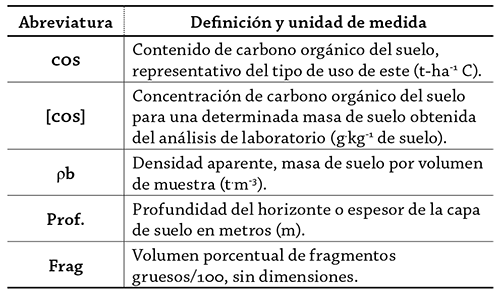 Para la determinación del COS> y el COe se utilizó la metodología propuesta por Rügnitz, Chacón y Porro (2009), que se describe en la siguiente ecuación: