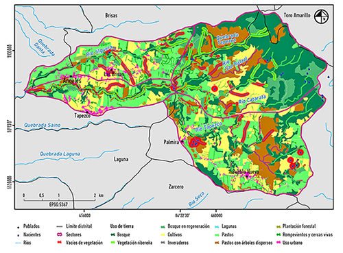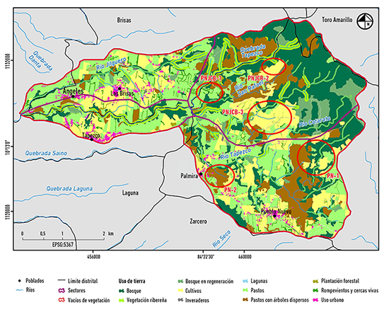 A partir de la fotointerpretación de imágenes de la Misión Costa Rica Airborne Research and Technology Aplications del Programa de Investigaciones Aerotransportadas y Sensores Remotos y la Administración Nacional de Aeronáutica y el Espacio de Estados Unidos (PRIAS y NASA 2005), a escala 1:5000, se obtuvo una capa preliminar de usos de la tierra, cuyos límites y contenido fueron corroborados y actualizados en campo para obtener un mapa de uso de la tierra en el 2012. Este fue el insumo principal para los análisis posteriores.
