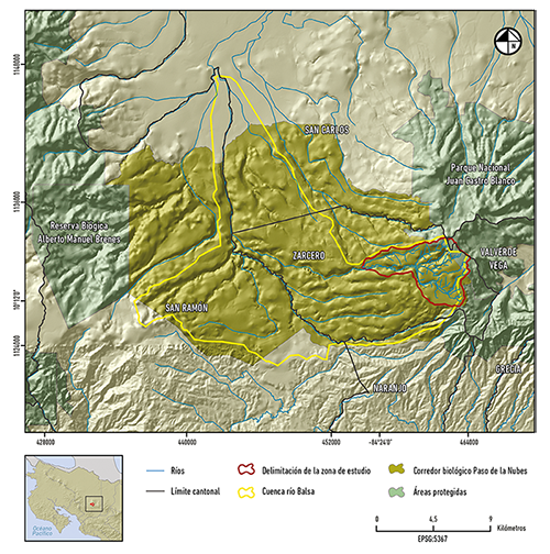 El área de estudio corresponde a la parte alta de la subcuenca del río Tapezco, ubicada en el cantón Zarcero, provincia Alajuela, Costa Rica (figura 1). Tiene un área de 28,7 km2 y drena sus aguas hacia el río Balsa. La subcuenca está ubicada dentro del Corredor Biológico Paso de las Nubes, cuyo objetivo es establecer una adecuada conectividad entre los ecosistemas del parque nacional Juan Castro Blanco y la reserva biológica Alberto Manuel Brenes.