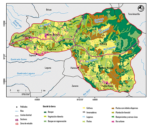 Según un análisis por sector, en comparación con los demás sectores, el PNJCB presenta el mayor porcentaje de área cubierta por bosque (42,43%), seguido de pastos con árboles dispersos (17,55%), lo que resulta beneficioso para la conectividad de la parte alta de la subcuenca, adyacente a un área protegida que tiene entre sus objetivos la defensa del recurso hídrico en la región. Los sectores Pueblo Nuevo, Tapezco y Brisas, en la parte baja de la subcuenca, presentan un predominio de cultivos y pastos con presencia de parches de bosque aislado (figura 4) o con formas alargadas que siguen la red hídrica.