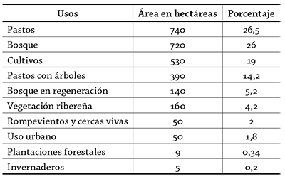 En la figura 3 y la tabla 1 se presenta la heterogeneidad de usos en la subcuenca, donde se observa un total de once categorías con el predominio del área de pastos (26,5%), seguido de la cobertura de bosque (26%), concentrado fundamentalmente en la parte alta de la subcuenca, y cultivos (19%). Los pastos arbolados representan un 14% y, por su parte, el bosque en regeneración tan solo un 5,2%.