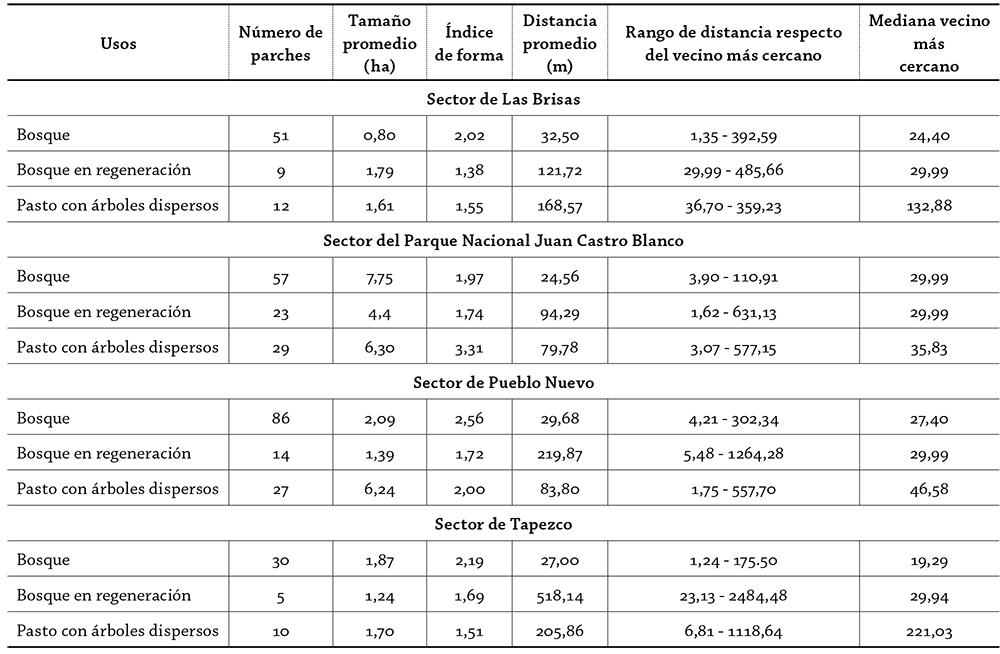 Las métricas de coberturas vegetales se presentan en la tabla 2, donde se observa que en el sector Las Brisas hay 51 parches de bosque con un tamaño promedio de casi 3 ha. Este es el sector que posee los parches de menor tamaño, lo que se explica por la gran diversidad de usos del suelo que existe allí. En los sectores de Pueblo Nuevo y Tapezco el tamaño promedio es similar: de 2 y 1,9 ha, respectivamente; sin embargo, la cantidad de parches en Pueblo Nuevo es 86, mientras que en Tapezco es 30, esto refleja que la fragmentación es mucho mayor en el sector de Pueblo Nuevo.
