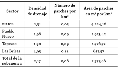 Esta diferenciación se manifiesta también en la relación de densidad de parches de bosque y la densidad de drenaje por área en la subcuenca, donde una relación positiva entre estos aspectos se encontró solamente en el sector del PNJCB, contrario a lo hallado en el sector de Las Brisas, en la parte baja de la subcuenca, donde la cantidad de parches es mucho mayor y cubre menos área que en el resto de los sectores, lo cual evidenció una mayor fragmentación del bosque.