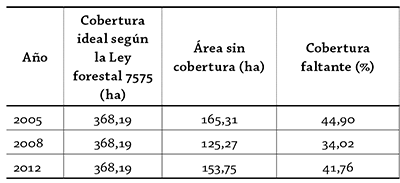 Un análisis más detallado de dichos vacíos se realizó para cada sector de la subcuenca y se determinó el área de cobertura vegetal faltante a lo largo de la red hídrica y las nacientes. Los resultados se muestran en la tabla 5 y figura 7.
