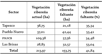 En el sector de Las Brisas, los vacíos de vegetación se concentran, de igual forma, en las zonas de alta pendiente. Este sector se caracteriza por una mayor presión en el uso de la tierra, por lo cual, la mayor parte de los vacíos están ocupados por cultivos e incluso algunas riberas están ocupadas por algún tipo de infraestructura urbana. En la parte baja de la subcuenca, el sector de Tapezco presenta junto con el PNJCB, en la parte alta, el menor porcentaje de vegetación ribereña faltante, esto obedece a que casi la totalidad del bosque en este sector se localiza a lo largo de la red hídrica. En el sector del PNJCB se encuentra la mayor área de bosque en la subcuenca, lo cual corresponde también con el menor porcentaje de vegetación ribereña faltante, con apenas un 34,48%.