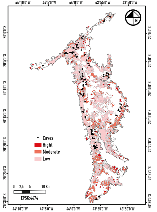 We would like to express our thanks to the National Institute of Space Research (INPE), which provided the Landsat images used to draw the map of vegetal cover and land use, through the Image Generation Division of Cachoeira Paulista/SP; to the National Center for Research and Conservation of Caves (ICBio/CECAV) to the National Council of Technological and Scientific Development (CNPq - grant 304682/2014-4); and to the Foundation for Research Support of Minas Gerais (FAPEMIG) (FAPEMIG - grant APQ-02956) for the research grant.