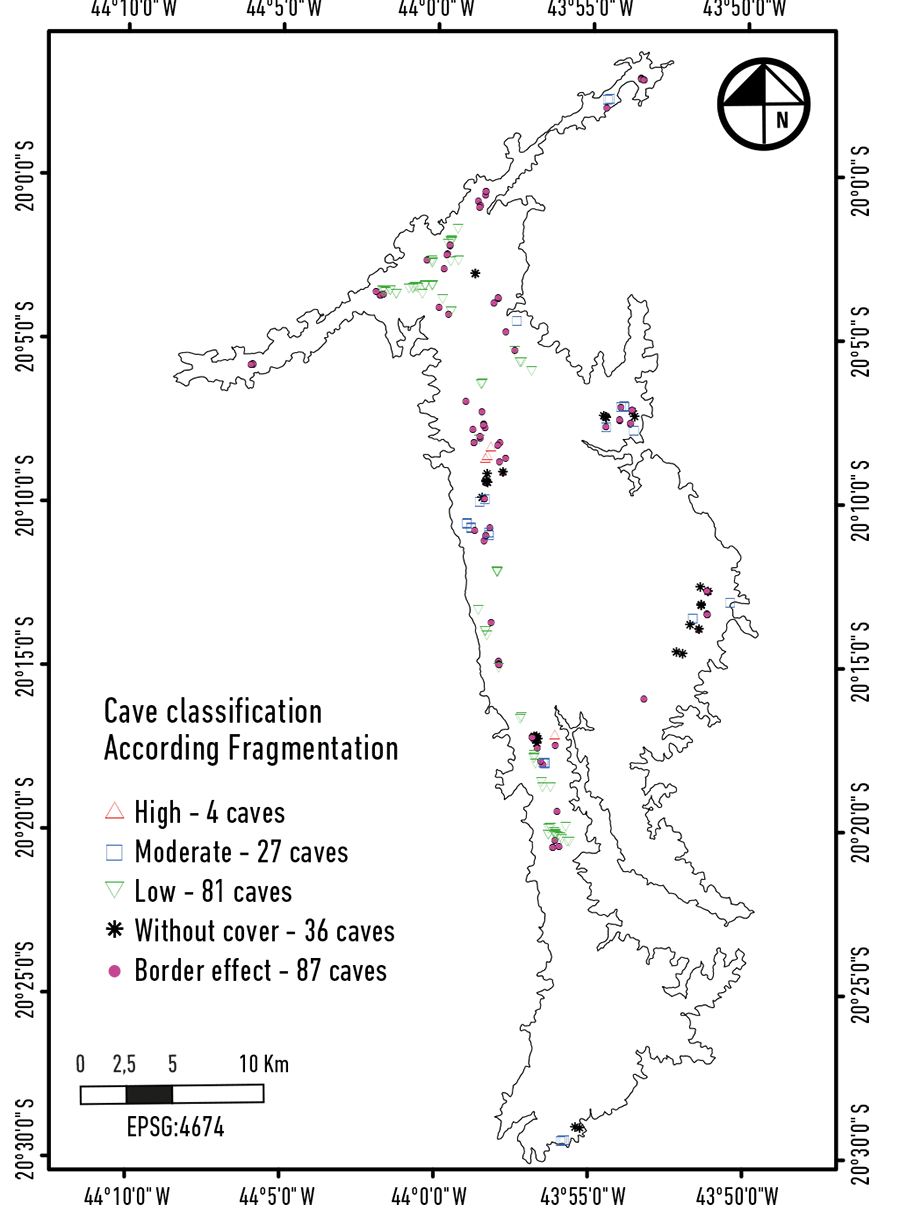 It is possible to identify three distinct groups of caves. The first includes 112 caves situated within the vegetal cover, which despite presenting different degrees of fragmentation, are less subject to the edge effect. Caves VL-29 and VL-30 are in this group, where the troglobitic species Collembola Troglobius ferroicus occurs (Zeppelini, da Silva and Palacios-Vargas 2014), and also cavity MS-19 for which the troglobitic spider Brasilomma enigmatica is recorded (Brescovit et al. 2012), both in areas classified with low degree of fragmentation.