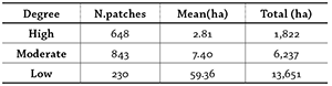 Table 1 presents data related to the number of patches, mean area, and total area of patches of vegetal cover according to the degree of fragmentation.
