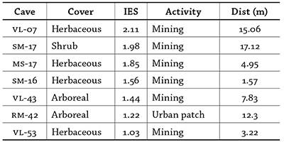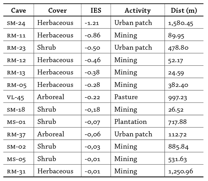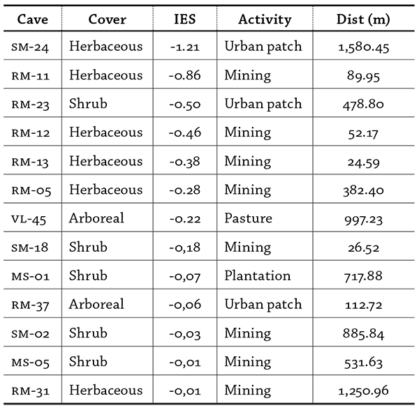 In relation to the speleological heritage, the fact that 52% of caves of the study area (36 without vegetal cover and 87 under edge effects) are directly threatened by anthropic actions is cause for concern, particularly if we take into account the scarce scientific knowledge on the subterranean ecosystem of this region. The analysis of IES for caves subject to edge effects reveals that even considering that many of them presented positive values of this index, the caves and their surroundings are located a few meters away from anthropized areas.