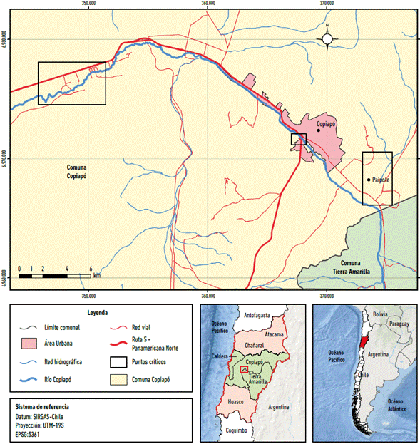 En términos procedimentales, si bien los fenómenos estudiados ocurren con simultaneidad, se realizan análisis paralelos para tres puntos críticos en los que la experiencia de afectación de los aluviones se repitió en el 2015 y 2017, como fueron: i) los sectores bajos del valle de Copiapó; ii) el sector urbano y iii) el barrio periurbano de Estación Paipote (Figura 1). En cada punto se analizan las dinámicas sociopolíticas y las interacciones de los actores emergentes de la sociedad civil con los actores del mundo público y privado, identificando las formas de agenciamiento frente a los contextos institucionales y riesgos socionaturales.