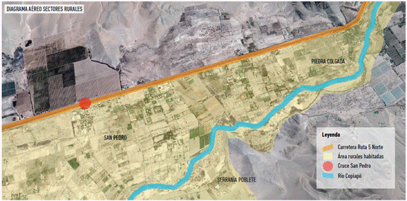 El primer punto crítico se encuentra en las áreas rurales de los sectores bajos del valle de Copiapó, en el descenso del lecho del río en dirección al océano pacífico. Distantes entre 15 a 30 km de la ciudad de Copiapó, se encuentran los sectores habitados de la Bodega, Chamonate, Piedra Colgada, Tres Hermanas, Serranía Poblete y La Copa que fueron afectados tanto en el 2015 como en el 2017 (Figura 2). A los efectos de las inundaciones de hogares, se suma el hecho de que las zonas de cultivos se vieron destruidas, lo cual afectó formas de economía local y producción a pequeña escala.