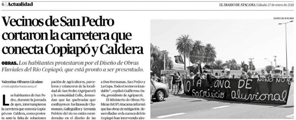 Olivares Licuime, Valentina. 2018. "Vecinos de San Pedro cortaron la carretera que conecta Copiapó y Caldera." Diario Atacama, 27 de enero, 2017. http://www.diarioatacama.cl/impresa/2018/01/27/full/cuerpo-principal/6/