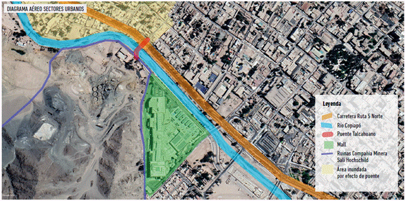 El segundo punto crítico se ubica en el sector central del espacio urbano, localizado en un nodo que se superpone de forma paralela al mall8 (centro comercial), el lecho del río Copiapó y la avenida Copayapu (principal arteria de transporte en la ciudad). Además, componen este paisaje urbano las ruinas de una empresa minera con sus respectivos relaves9, una abandonada huella productiva del siglo XX.