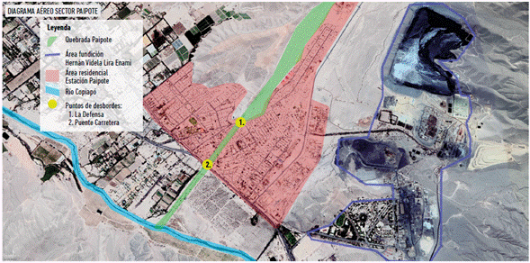 Otro elemento relevante en su espacialización es que colinda directamente con la Fundición Paipote, planta fundidora "Hernán Videla Lira" perteneciente a ENAMI13, puesta en funcionamiento a partir de 1952 como parte de las políticas desarrollistas de mediados del siglo pasado. En la actualidad, esta planta pirometalúrgica procesa una gran variedad de productos mineros y cuenta con una capacidad de procesamiento de 340.000 toneladas anuales (ENAMI 2018). Producto de esta colindancia, a partir de 1990, los vecinos se han organizado y protestado por las emisiones y concentraciones ambientales de dióxido de azufre, las cuales superan la normativa nacional, por lo cual en 1993 se declaró como zona saturada por anhídrido sulfuroso (INDH 2015). Esto ha conllevado la afectación sistemática de actividades cotidianas, tales como la paralización de actividades educativas y laborales, así como también en el aumento de atenciones de urgencias ante dificultades respiratorias y de asma en días en que los niveles de S02 son mayores a 1.000 mg/m3N (SEREMI de Salud Atacama 2011). Esta injusticia ambiental de la población ante la exposición a pasivos y excreciones ambientales emanadas por la fundición (Figura 6), a su vez, se ve acrecentada por la "sentida" marginación y desigual distribución de los recursos de la modernización espacial, en comparación con Copiapó, lo que conlleva al imaginario de Paipote como "patio trasero". En la Figura 6, un diagrama ilustra diversas áreas y lugares. En área roja se identifica el sector residencial de Estación Paipote, los que se vieron afectados por las inundaciones y aluviones en ambos eventos; otro elemento relevante del área se destaca en contorno morado, la Fundición Hernán Videla Lira de ENAMI; en este contorno se aprecian las áreas industriales y los focos de contaminación.