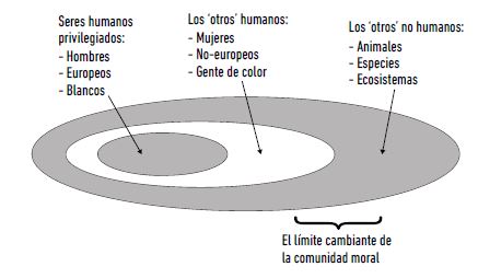 Pero la geografía humanista al otorgar una posición central al ser humano también ha contribuido, junto con otras ciencias, a fomentar la construcción antropocéntrica del entorno espacial, es decir, a posicionar al ser humano como superior ante el resto del mundo vivo. A pesar de ello, hay todo un sistema de opresión entre los animales humanos y los no humanos que revela también las desigualdades de la propia sociedad humana. Por ejemplo, Fennell (2012) evidencia que los seres humanos privilegiados en el mundo son los hombres europeos y blancos, quienes ejercen su poder consciente o inconscientemente sobre los "otros" humanos, como las mujeres o las personas no europeas y no blancas; y, en su conjunto, estos grupos ejercen dominio y opresión en la otredad animal (Figura 1). Aunque la geografía humanista ha logrado revelar las desigualdades dentro de la sociedad humana, no ha evidenciado sus relaciones inequitativas con los animales no humanos.