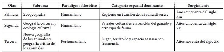 La primera ola está asociada con la zoogeografía (centrada en los espacios de los llamados animales silvestres) y la segunda con la geografía cultural (conexa a los paisajes culturales y atingentes a los llamados animales domésticos). Estas dos olas tienen en común que se sustentan en el paradigma humanista, el cual, en este caso, incide en la producción de una geografía antropocentrista que valora a la otredad animal como inferior al ser humano y, en consecuencia, le permite disponer de ella como recurso de su propiedad. Pero desde finales del siglo pasado surgió la tercera ola, o nueva geografía de los animales, que desde el poshumanismo se mostró más empática en su relación con los animales no humanos; esto se logró gracias a evidencias filosóficas y científicas que concluyeron que los animales no humanos son seres sintientes, autoconscientes y con intereses propios, por lo que no había justificación ética para que fueran vistos como simples recursos (Hribal 2014).