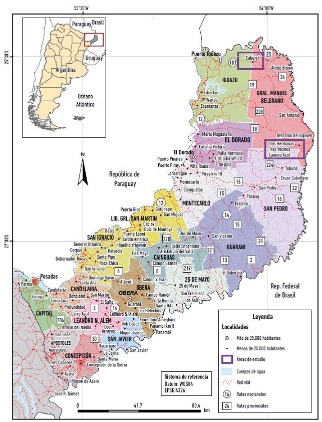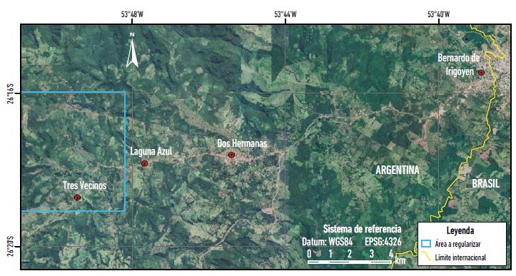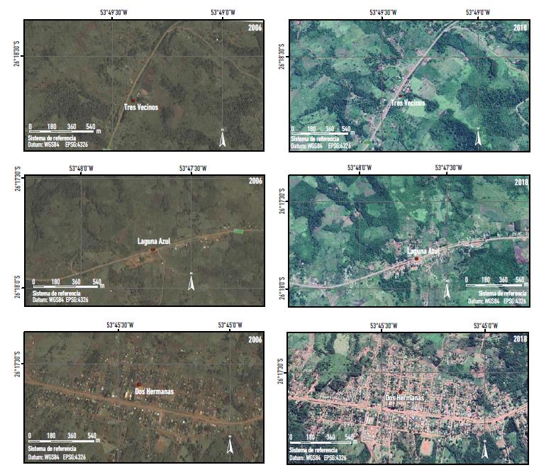 En este apartado se aborda la producción de espacios habitacionales en algunos pequeños parajes rurales (Dos Hermanas, Laguna Azul y Tres Vecinos) localizados en torno a la ruta provincial n.°17 en el nordeste de la provincia. Los asentamientos bajo análisis crecieron, particularmente, a partir del proceso de ocupación de tierras privadas (latifundios donde se desarrollaba la actividad forestal) que tuvo lugar hacia principios de la década de los noventa en el límite de los departamentos de San Pedro y General Belgrano. Dicha ocupación se inicia como resultado del avance del frente agrícola y la disminución de tierras fiscales disponibles, dando origen a un conflicto por la tierra que desde el 2004 está en vías de regularización, proceso que acentuó el crecimiento de los parajes desde ese momento (Figura 2).5