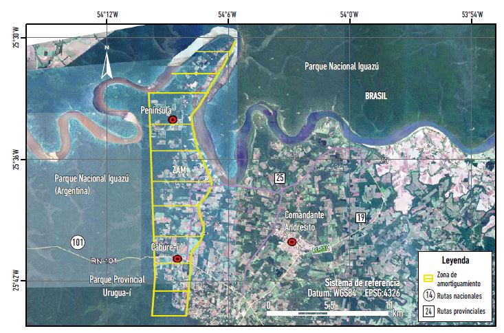 El PNI, creado en 1934, es de los más antiguos del país y ocupa 67.620 ha. Al igual que el resto de los parques nacionales y que las áreas naturales protegidas en general, se vale de la herramienta de la planificación y en particular la zonificación como "metodología central para establecer los lineamientos de administración de las acciones de conservación" (Ministerio de Ambiente y Desarrollo Sustentable 2017, 313). Desde nuestro punto de vista, la zonificación constituye uno de los mecanismos para desplegar un OT en base a criterios ambientales. Como parte de esta, se establece la ZAM en el límite Este. Desde hace ya varias décadas, se reconoce a este límite como uno de "los más problemáticos [...], ya que casi en su totalidad está en contacto con terrenos privados con intensa actividad agropecuaria" (Ministerio de Ambiente y Desarrollo Sustentable 2017, 315). El patrón de ocupación de la zona es bastante diferenciado entre el sector Norte (Península): chacras de en promedio 100 ha, asignadas a colonos capitalizados en el Plan de Colonización de Andresito, que actualmente producen en su mayoría yerba; y el sector Sur (Cabure-í): parcelas de 5-10 ha promedio, en su mayoría ocupantes sin título de propiedad, productores de tabaco, alimentos para subsistencia y más recientemente algunos productos para comercialización (mandioca y derivados, dulces y conservas, hortalizas y frutas).