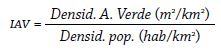 Para a estimativa do IAV dos referidos bairros, foi utilizado o valor da densidade de áreas verdes (m2/km2) do quantitativo do verde urbano extraído do mapa de uso e cobertura do solo dividido pelo valor da DP (hab/km2), extraída do mapa dasimétrico, conforme a formulação matemática (Equação 1) descrita a seguir.