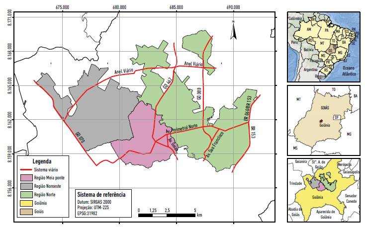 A área de estudo corresponde ao recorte espacial das regiões administrativas Norte, Noroeste e Meia Ponte, situadas no município de Goiânia (Figura 1), capital do estado de Goiás e localizada na região central do Brasil. Com extensão territorial de 728,841 km2 e população de mais de 1.302.001 de habitantes, Goiânia possui densidade demográfica de 1.776,74 hab/km2, estimada no último censo demográfico do Instituto Brasileiro de Geografia e Estatística - doravante, IBGE (2010). De acordo com a mesma instituição, seu perímetro urbano de 256,8 km2 faz com que a cidade seja considerada a oitava metrópole brasileira no ranking de áreas urbanizadas.