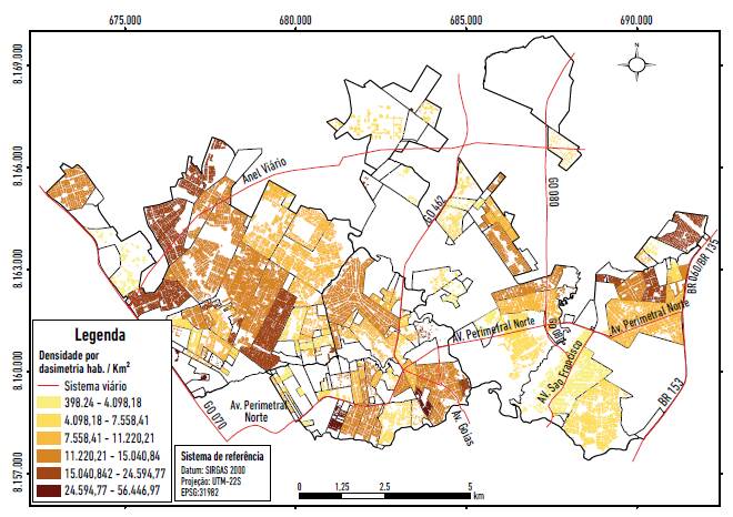 Um dos fatores que agravam os problemas de desordem social e ambiental é o crescimento populacional não planejado, que é caracterizado pelo rápido avanço das periferias em relação ao próprio núcleo do município (Maricato 2003). Dessa forma, a seleção das três regiões administrativas ocorreu devido à expansão urbana a partir dos anos 1980 e à consequente desigualdade social que as caracterizam como áreas periféricas de maiores índices de segregação socioespacial da cidade de Goiânia (Moysés 2004). Com extensão territorial de 108,021 km2 e população estimada em 429.730 habitantes, essas regiões equivalem, juntas, a 14,82% da área do município de Goiânia. Sua DP, calculada pelo método dasimétrico, varia de 398,24 hab/km2 a 56.446,97 hab/km2, sendo distribuída, entre os setores censitários, dos menos aos mais densamente habitados (Figura 2).