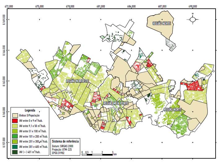Os resultados demonstram ainda o processo histórico de formação da cidade de Goiânia, em que a região situada mais ao norte sofre influência do aeroporto, do Campus da Universidade Federal de Goiás e de áreas privadas destinadas à especulação imobiliária. Por outro lado, a região mais ao noroeste era formada por áreas públicas que o próprio Estado disponibilizou para a implantação de habitações populares, o que explica o maior quantitativo de bairros com IAV abaixo de 9m2/hab.