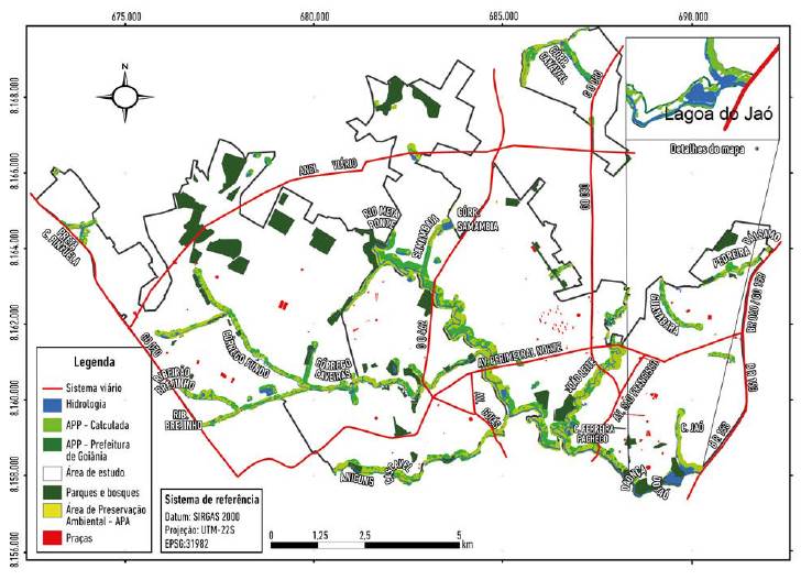 Contudo, o contraste entre as APPs, efetivamente preservadas e APPs demarcadas pela prefeitura, e que deveriam estar preservadas, de acordo com o Código Florestal Brasileiro, é notório em todos os corpos hídricos das três regiões em análise (Figura 6). Constatou-se que, das áreas de APPs de 10.039.208,13 m2 demarcadas pela prefeitura, apenas 3.457.990,07 m2 possuem vegetação arbórea, portanto somente 34,44% dessas áreas estão preservadas. Tais cenários foram mapeados nas APPs do Ribeirão Guanabara, porção leste, e no Rio Meia Ponte, porção central. Em ambos os casos, a vegetação ciliar foi parcialmente suprimida, com destaque ao fato de que o Rio Meia Ponte é o principal ponto de captação de água para o abastecimento público da cidade de Goiânia. Situação semelhante é identificada também nos ribeirões Anicuns e Caveiras.