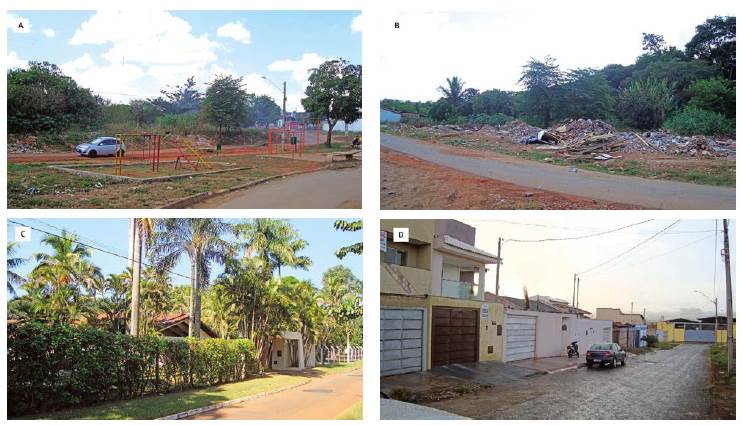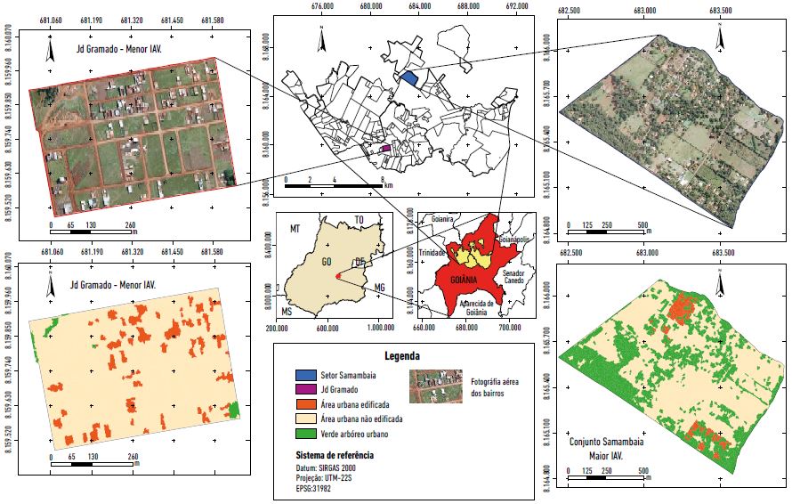 A Figura 7 ilustra os bairros Conjunto Samambaia e Jardim Gramado, que apresentam o maior e o menor IAV, respectivamente. O Conjunto Samambaia, situado na Região Norte, próximo ao Campus II da Universidade Federal de Goiás, possui 43 lotes (modelo - tipo chácaras de alto padrão social) com área total de 944.285 m2 e área verde de 329.070 m2. Assim, esse bairro, com população de apenas 17 habitantes, foi o que apresentou o maior IAV, igual a 19.357 m2/hab.