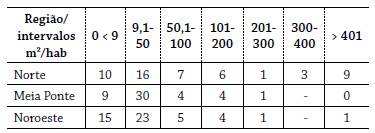 Como o fator determinante é o número de habitantes pelo quantitativo da extensão das áreas verdes, fica evidente que, das três regiões em análise, a Região Meia Ponte detém o cenário menos favorável, em que 9, do total de seus 48 bairros, foram classificados com índice inferior a 9 m2/hab.