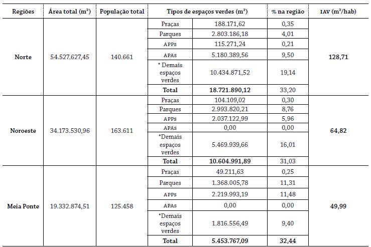 A Tabela 3 apresenta a população total e o quantitativo de espaços verdes mapeados, bem como o IAV calculado para cada uma das três regiões em análise. É possível observar que a Região Norte possui o maior IAV, quase o triplo do valor da Região Meia Ponte e aproximadamente o dobro da Região Noroeste. Sua população total de 140.661 habitantes resulta em um IAV de 128,71 m2/hab. Valor muito próximo ao encontrado por Martins Júnior (2013) para o município de Goiânia, que foi da ordem de 100 m2 de áreas verdes por habitantes. Porém, é importante mencionar que tal valor é um índice médio, estimado para todo o município, o qual não representa sua variabilidade espacial, o que conduz a uma homogeneização da informação.