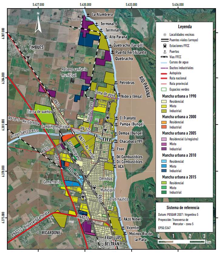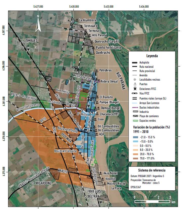 Las áreas residenciales crecieron hacia el Oeste, próximas a zonas rurales/agrícolas; al Este se encuentra el frente fluvial con puertos que pugnan por expandirse sobre áreas residenciales consolidadas. Asentamientos precarios crecieron sobre el arroyo San Lorenzo, que divide la localidad homónima de Puerto General San Martín y que, previo a su desembocadura en el Paraná, recibe el drenaje de desagües industriales, residuos sólidos de asentamientos y efluentes cloacales crudos sin tratamiento. También se observaron asentamientos en el acceso de la AO12 y en terrenos aledaños al ferrocarril (Rigotti 2010).