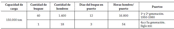 El mencionado avance en la concepción de los puertos y sus actividades también tuvo un correlato en la velocidad de circulación de las mercancías, en la productividad y en el empleo. Tal como se puede observar en la Tabla 1, para un mismo tonelaje de carga se fue pasando desde los primitivos puertos, de primera y segunda generación, en pocas décadas y junto a la incorporación tecnológica, a reducir sustancialmente la operatoria portuaria en tiempos y en personal, tal como los puertos de cuarta y quinta generación.
