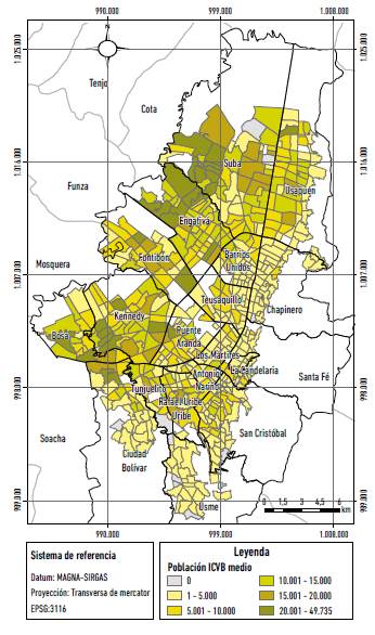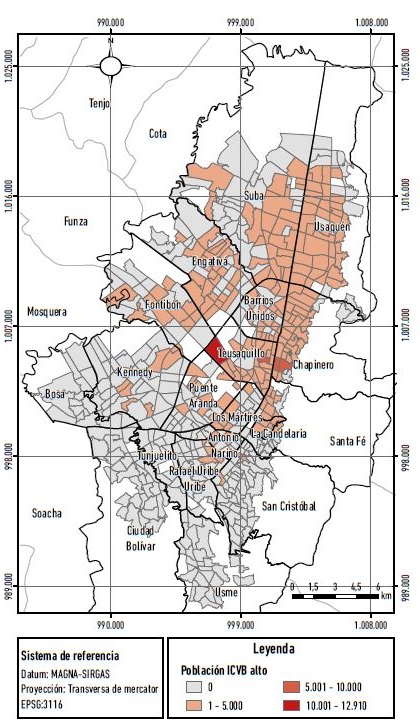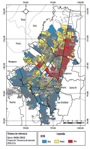 Al espacializar los resultados del ICVB en Bogotá, se obtiene una distribución con un patrón fuerte de concentración espacial (Figura 1). Los índices altos están presentes en el eje que va desde el centro hacia el Norte por el sector Oriente de la ciudad. Recíprocamente, se obtienen índices bajos hacia el Sur, en una franja que se extiende de Oriente a poniente.