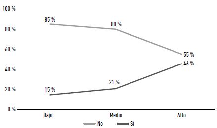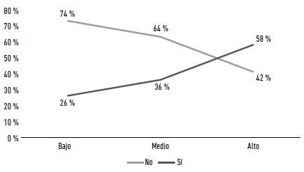 Un comportamiento similar se da en la práctica de algún deporte, ya que nuevamente se refleja la diferencia según su ICVB. En efecto, solo el 26% de los hogares que residen en sectores con ICVB bajo practican con frecuencia algún deporte a diferencia del status alto que es del 58% (Figura 13).