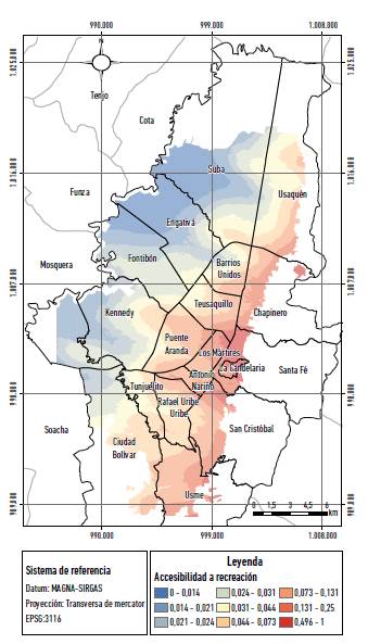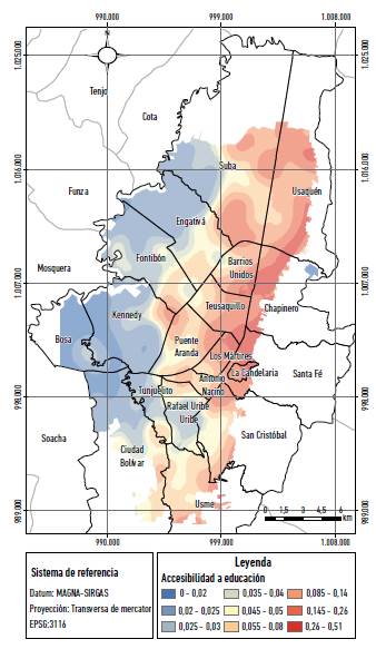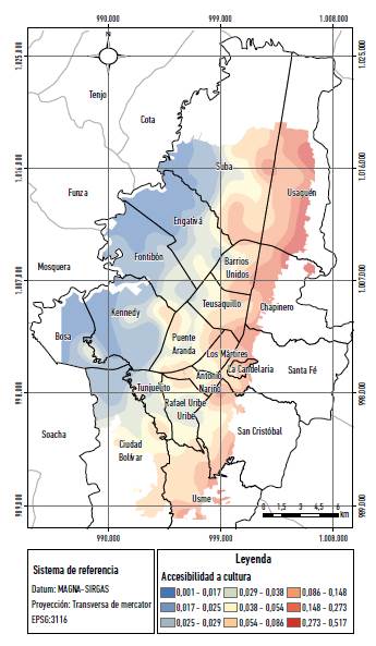 Distribución espacial de accesibilidad a servicios de educación, cultura y recreación