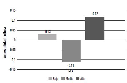 Los resultados del indicador de accesibilidad calculado para los equipamientos de educación, cultura y recreación y deporte muestran que hay una diferencia entre los grupos sociales, según su clasificación en ICVB bajo, medio y alto. Al aplicar una prueba de hipótesis para establecer la diferencia de las medias entre los grupos, con un p valor menor a 0,05 se aprueba la hipótesis alterna de que hay diferencias en el acceso.