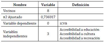 Como se aprecia en la Tabla 4 el modelo explicativo, ajustado localmente con una relación de 8 vecinos (teniendo en cuenta la contigüidad en bordes y esquina), pudo explicar el 73% de los valores de la variable dependiente, lo que demuestra que en Bogotá el ICVB se puede predecir en función de la accesibilidad a equipamientos de educación, cultura y educación. El modelo es válido dado que los residuales de la regresión, es decir, la diferencia entre los valores pronosticados y los observados, se distribuyen aleatoriamente.