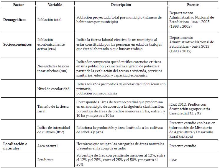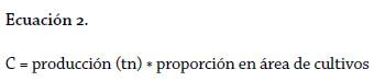Para el estudio, las variables explicativas fueron seleccionadas de acuerdo a una revisión de literatura sobre conversión de humedales (van Asselen et ál. 2013) y la disponibilidad de información de series de datos en el periodo de estudio (1992 al 2013). La Tabla 2 indica el conjunto de variables utilizadas. Adicionalmente, se estimó el índice de intensidad de uso para cultivos -en adelante, IIUc-, usado por Erb (2012) y Kühling, Broll y Trautz (2016), con el fin de medir las actividades de uso agrícola asociadas con el aumento en la demanda de alimentos; para el cálculo de este índice se seleccionaron los cultivos de papa y cebolla, tomando como variable de entrada la producción y la proporción de área destinada a estos cultivos para los periodos de tiempo analizados (Ecuación 2).