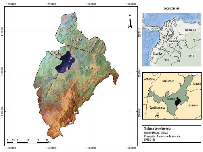 La zona de estudio comprende los municipios de Aquitania, Cuítiva, Tota y Sogamoso (Departamento de Boyacá), abarcando una superficie de 132.425 ha. Dentro del área se destaca el lago de Tota, considerado el humedal altoandino de mayor extensión del país (Figura 1). El lago fue declarado como área de importancia para la conservación de aves (AICA) en 2007 y en 2012 la Red Mundial de Humedales le otorgó el globo gris, debido a amenazas por degradación, producto de actividades agropecuarias, pérdida del humedal por contaminación y exclusión de comunidades locales de su protección y buen manejo.