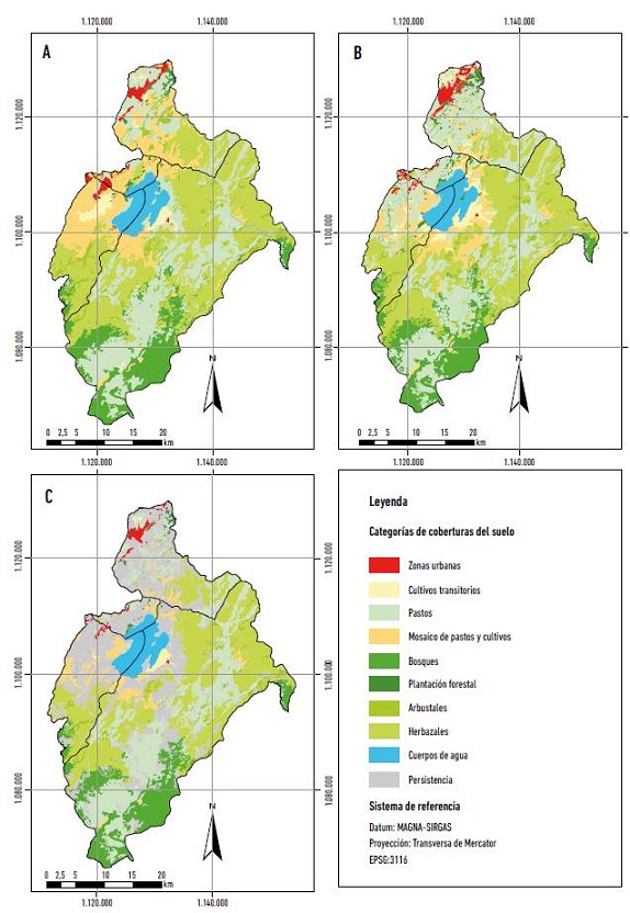 El cambio de la cobertura del suelo en términos generales no presentó una dinámica alta en la región, debido a que la persistencia del paisaje asociada con las coberturas naturales y las coberturas de pastos y mosaico de pastos y cultivos fue mayor que las transiciones entre diferentes categorías de cobertura; esto puede explicar el hecho de no haberse encontrado a nivel regional diferencias significativas en la dinámica de cambio. Estos resultados coinciden con lo encontrado por Mateus (2014) para el periodo 1995-2010 para la misma región, y difieren de lo reportado por Rodríguez, Armenteras y Alumbreros (2013) para los Andes colombianos, quienes asociaron la dinámica de cobertura a cambios entre categorías de bosques a pastizales por procesos de deforestación. Igualmente, las transiciones sistemáticas asociadas a las coberturas de pastos y mosaico de pastos y cultivos es un patrón consistente con lo hallado por Sánchez-Cuervo et ál. (2012), quienes atribuyeron a prácticas tradicionales de rotación de cultivos de corta duración, pastos y áreas de descanso, la dinámica del uso del suelo en los departamentos de Santander y Boyacá.