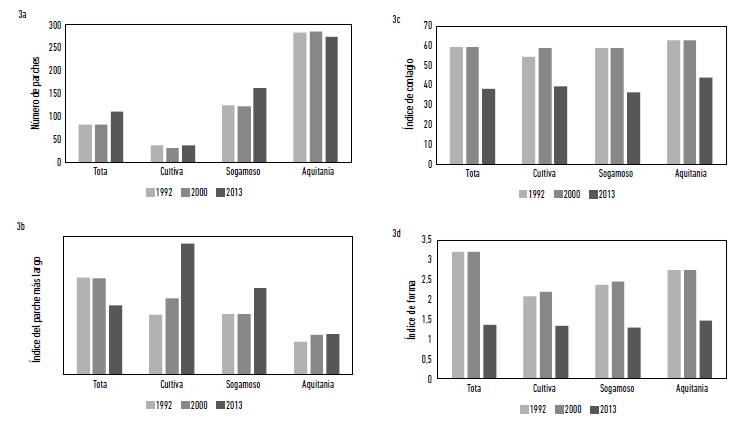 A nivel de municipio se observó una tendencia similar que a nivel regional. Entre 1992 y 2013, el NP aumentó en Tota (82 a 111) y Sogamoso (123 a 162), mientras que para Aquitania y Cuítiva fue similar (Figura 3a). Para el 2013, el índice del parche más largo se presentó en Cuítiva (47,51%) y estuvo asociado a la categoría de pastos y mosaico de pastos y cultivos, mientras que el menor valor correspondió a Aquitania (14,84%), asociado a herbazales (Figura 3b). El índice de contagio y de forma muestran que los municipios presentaron condiciones similares con una tendencia a la disminución para el 2013; el índice de uniformidad indicó que los cuatro municipios son semejantes con un rango de 0,77 a 0,86; es decir, presentan abundancias de clases de coberturas en proporciones similares (Figuras 3c y 3d).