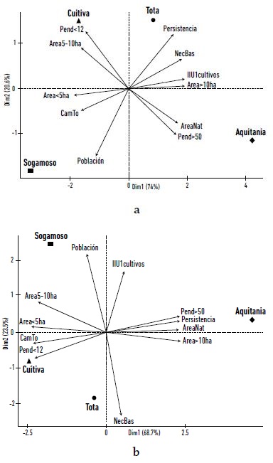 El análisis de componentes principales arrojó que para el primer periodo de estudio, el IIUc y el tamaño de predios mayores a 10 ha fueron los factores de cambio que más aportaron en sentido positivo a la dinámica de la cobertura; y, con el tamaño de predios menores a 5 ha que aportaron en sentido negativo, explicaron un 74% de la varianza. Los aspectos demográficos relacionados con la población total fueron un factor importante en la segunda componente, explicando el 20,6% de la varianza (Figura 4a). Para el segundo periodo, los dos primeros componentes explicaron el 92,2% de la varianza; el tamaño de predios y el porcentaje de área natural fueron las variables que más aportaron al primer componente (68,7%); mientras que la segunda componente se asoció al índice de necesidades básicas insatisfechas (NBI) y población total (Figura 4b).