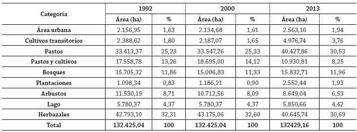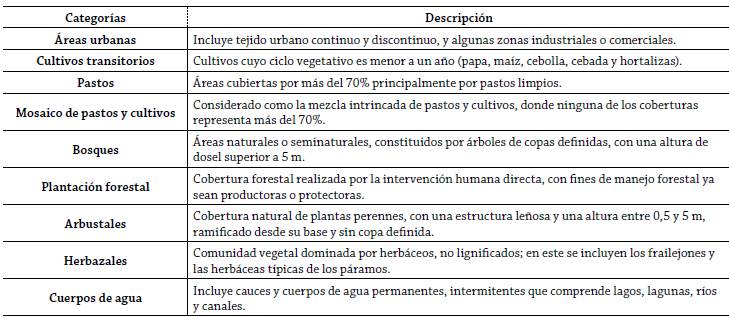 La elaboración de los mapas se basó en la metodología de Corine Land Cover adaptada para Colombia (IDEAM 2010), que permite describir, caracterizar, clasificar y comparar las características de la cobertura de la tierra, a partir de interpretación visual en pantalla de imágenes de resolución media (Landsat); así, se discriminaron las coberturas del suelo a un nivel de clase II y en algunos casos III. Se identificaron 9 categorías de cobertura: áreas urbanas, cultivos transitorios, pastos, mosaico de pastos y cultivos, bosques, plantaciones forestales, arbustos, herbazales y cuerpos de agua (Tabla 1). Para el proceso de control de calidad temática se usó una imagen Rapideye (path/row 96678) del 31 de diciembre de 2013, siguiendo el protocolo establecido en Corine Land Cover para coberturas con algún grado de incertidumbre, con 50 puntos de control verificados en campo en octubre de 2014 y revisión secundaria de producción agrícola por municipio. El proceso de digitalización y estructuración de la información se llevó a cabo en el sofware ArcGlS (10.2)®.