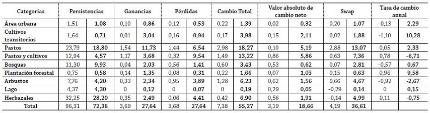 Se aplicó la metodología propuesta por Pontius, Shusas y McEachern (2004), que consiste en generar una matriz de transición, la cual, a partir de una tabulación cruzada, indica las pérdidas y ganancias brutas, el cambio neto y el intercambio entre las categorías de cobertura para los intervalos de tiempo analizados (primer periodo: 1992-2000; y segundo periodo: 2000-2013). Las ganancias correspondieron a la proporción del paisaje que tuvo aportes en área en un periodo de tiempo desde otras categorías; la pérdida indicó la proporción de área que disminuyó en el intervalo de tiempo; el cambio neto representó la diferencia entre ganancias y pérdidas por categoría atribuible a los cambios en la cantidad de área; y el intercambio (swap) correspondió al cambio total menos el cambio neto para cada categoría. La diagonal de esta matriz indicó la persistencia, es decir, el área de una determinada categoría que permaneció inalterada o sin cambios entre los tiempos 1 y 2, tanto en términos de superficie (ha) como de ubicación espacial (Rodríguez, Armenteras y Alumbreras 2013). Los valores de dinámica de cambio se obtuvieron en Idrisi Selva 17.0 ®, mediante el uso del Módulo Land Change Modeler (LCM) (Eastman 2012); con ellos se calcularon las matrices y mapas de cambio.