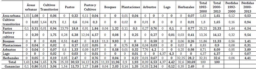 La matriz de transición (Tabla 4) mostró que los cambios más importantes a nivel regional se dieron en las categorías de pastos y mosaico de pastos y cultivos para ambos periodos de estudio (1,49 y 2,98% para el primer periodo y 18,78% y 9,54% para el segundo periodo). El segundo periodo (2000 a 2013) presentó las mayores tasas de cambio, donde los cultivos transitorios tuvieron el mayor valor (10,28%) con una ganancia del 3,04%, mientras que el mosaico de pastos y cultivos tuvo una tasa negativa del -6,71%. Los cuerpos de agua presentaron una menor dinámica, con una leve pérdida del cuerpo lagunar (municipios de Cuítiva y Tota), mientras que las áreas urbanas tuvieron un mayor crecimiento (municipio de Sogamoso) con un 3,75% (Figura 2b).