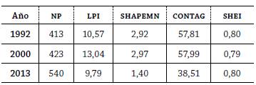 La Tabla 6, presenta los índices del paisaje en los años de estudio, donde la tendencia de las métricas es similar, con un pequeño incremento de NP, SHAPE y CONTAG, así como un incremento de LPI asociado a la dominancia de la categoría de herbazales. Para el 2013 hubo un incremento en el NP, disminución del LPI y del índice de forma, atribuible a los pastizales y valores más bajos de CONTAG. El SHEI permaneció estable con valores cercanos a 0,8.