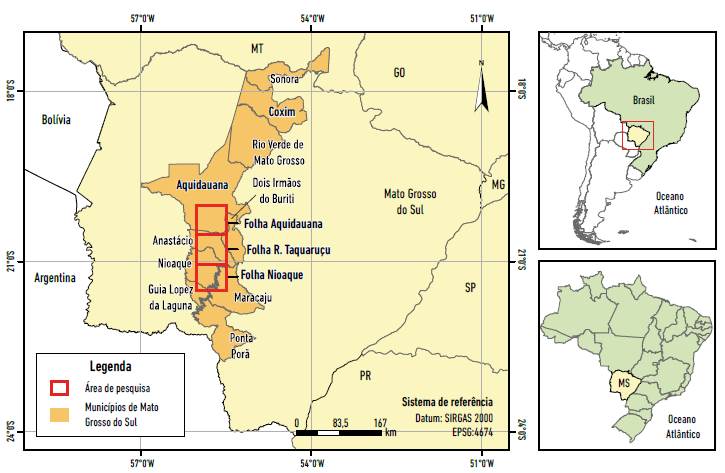 A área de estudo está localizada na porção centro-oeste do estado de Mato Grosso do Sul, região de Aquidauana-Nioaque, com uma área de aproximadamente 8.650,000 km2, que abrange as folhas do Exército brasileiro, Aquidauana (SF.21-X-A-III), Ribeirão Taquaruçu (SF.21-X-A-Vl) e Nioaque (SF.21-X-C-III), na escala 1:100.000, cujas coordenadas do extremo das folhas são: 21° 30'-20° 00' S (latitudinais) e 55° 30-56° 00' w (longitudinais) (Figura 1).