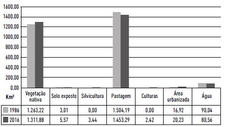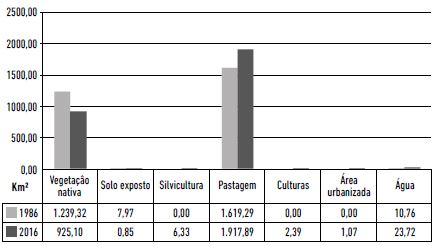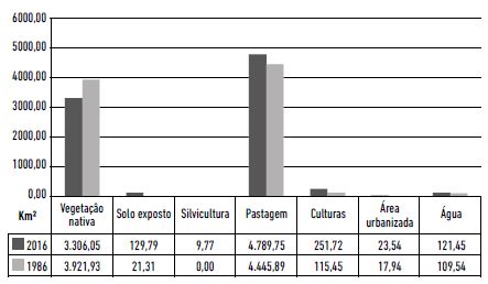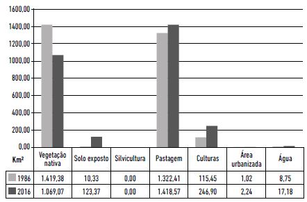 Como se pode observar, na soma das três folhas topográficas, há a clara redução de vegetação nativa (614,9 km2) e o aumento das áreas de pastagens (343,02 km2) e de culturas temporárias (136,27 km2), além de outras variações nos usos, como pode ser observado na Tabela 1 e na Figura 9.